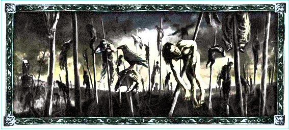 visión aterradora de millares de cuerpos empalados y en alto grado de
